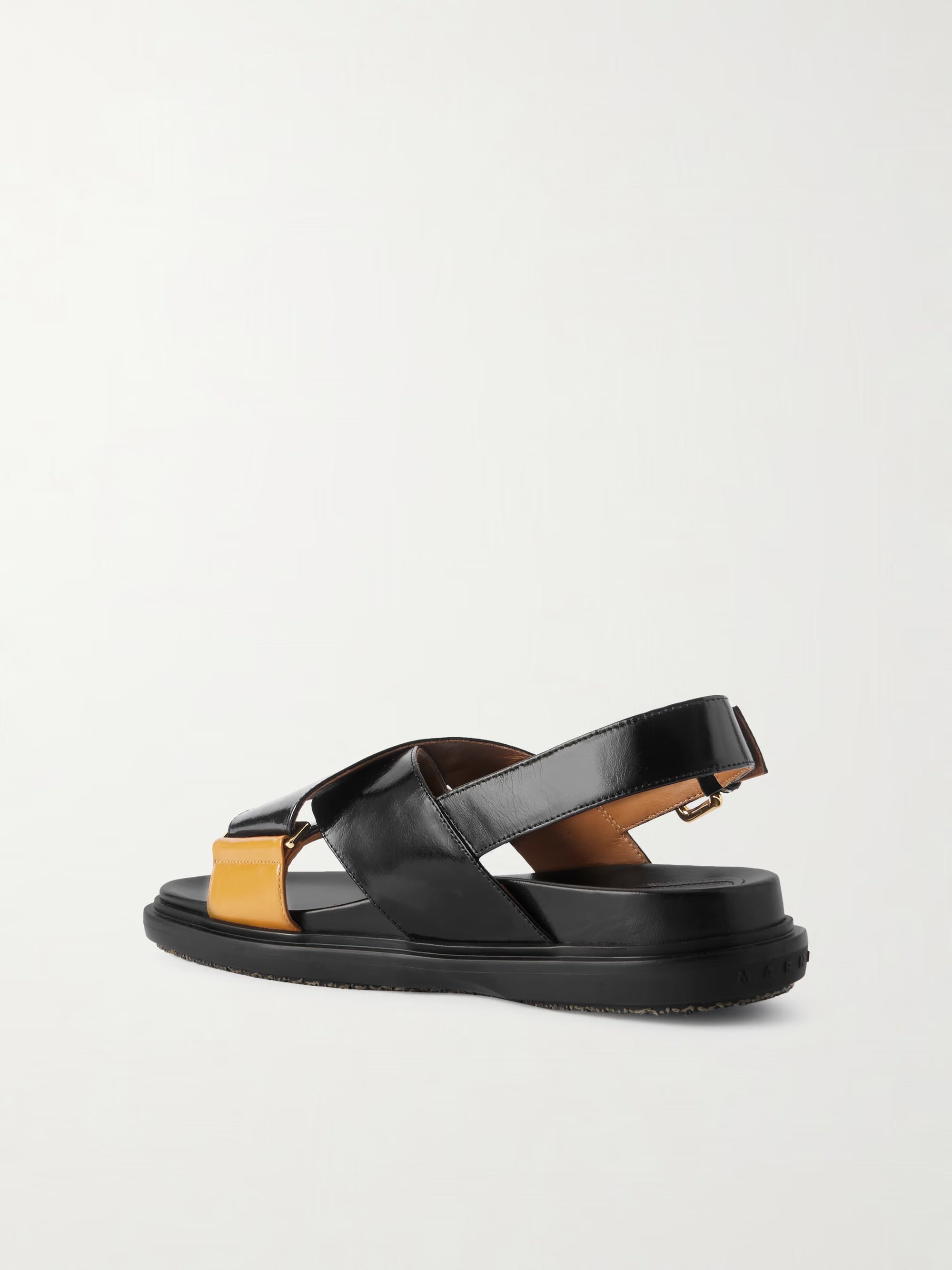 Iconic crisscross Fussbett sandal crafted from smooth calfskin leather, fastening with an adjustable buckle strap. Monocolour design with tonal leather insole and rubber outsole. Raised Marni lettering on the heel. Made in Italy