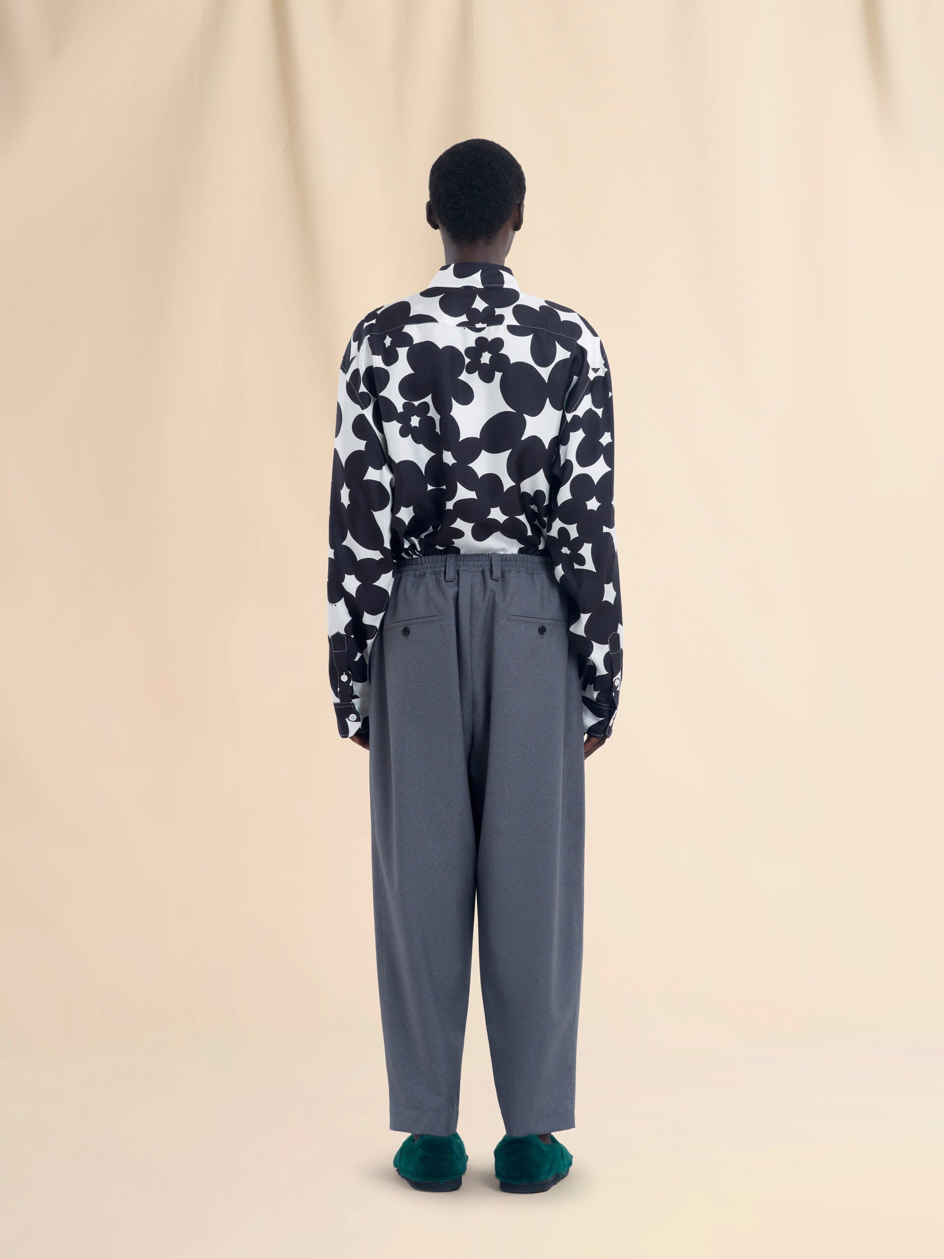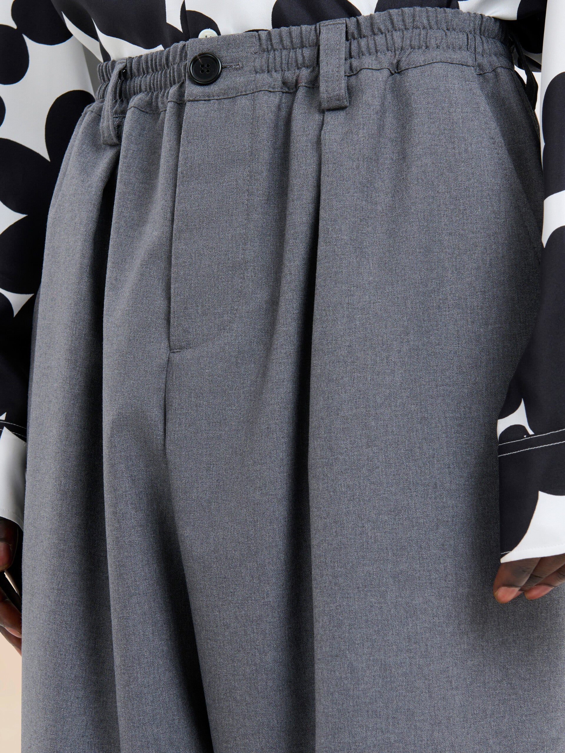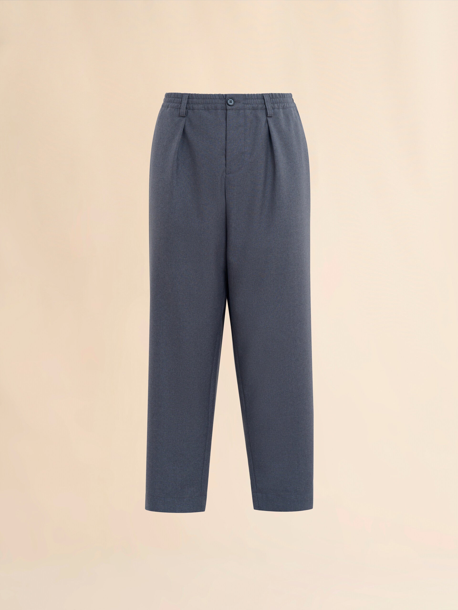 Cropped trousers made from tropical wool. Loose mid-rise fit with front pleats, elasticated drawstring waist and belt loops. Horn button closure. Slant pockets and back buttoned welt pockets.