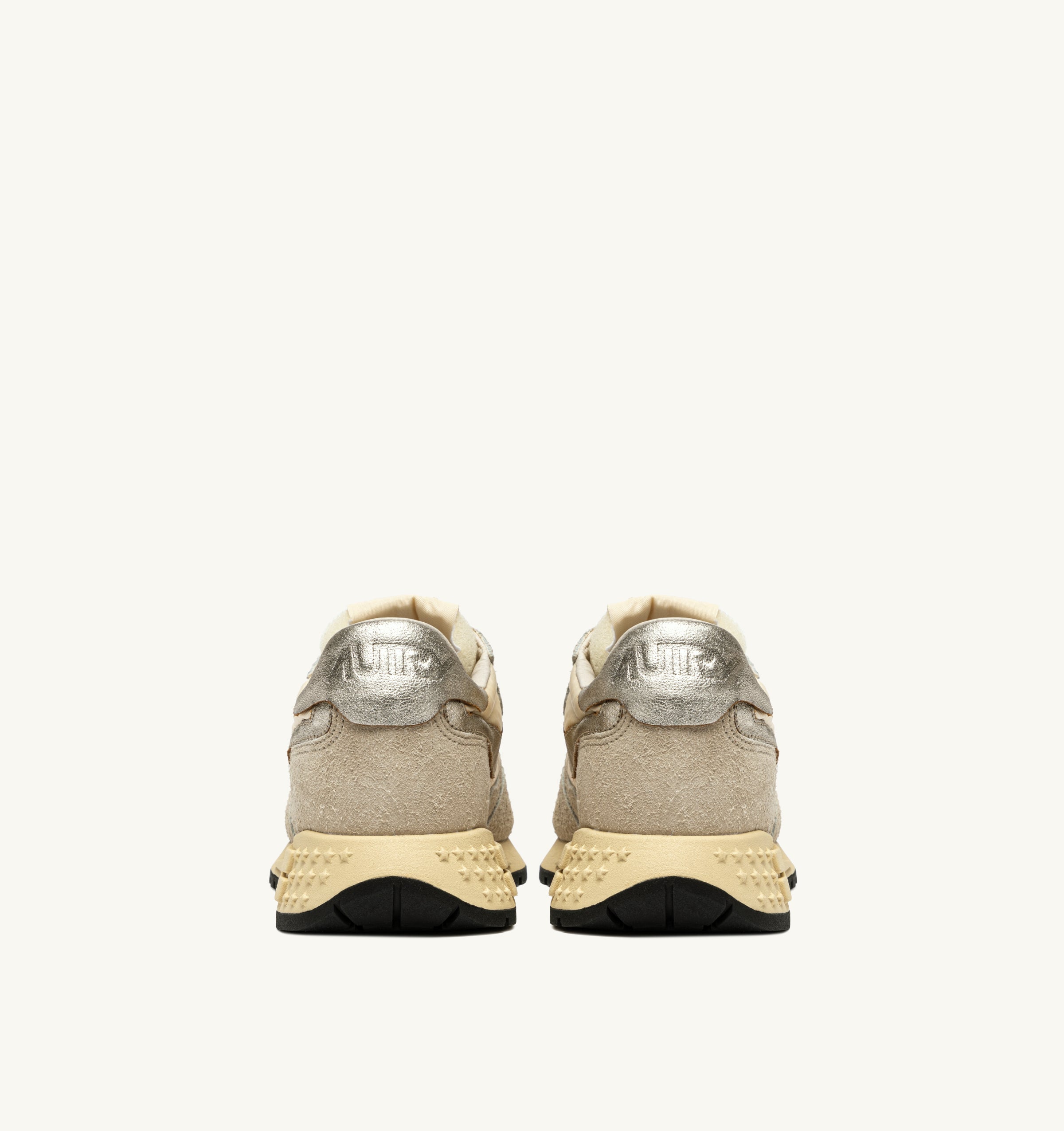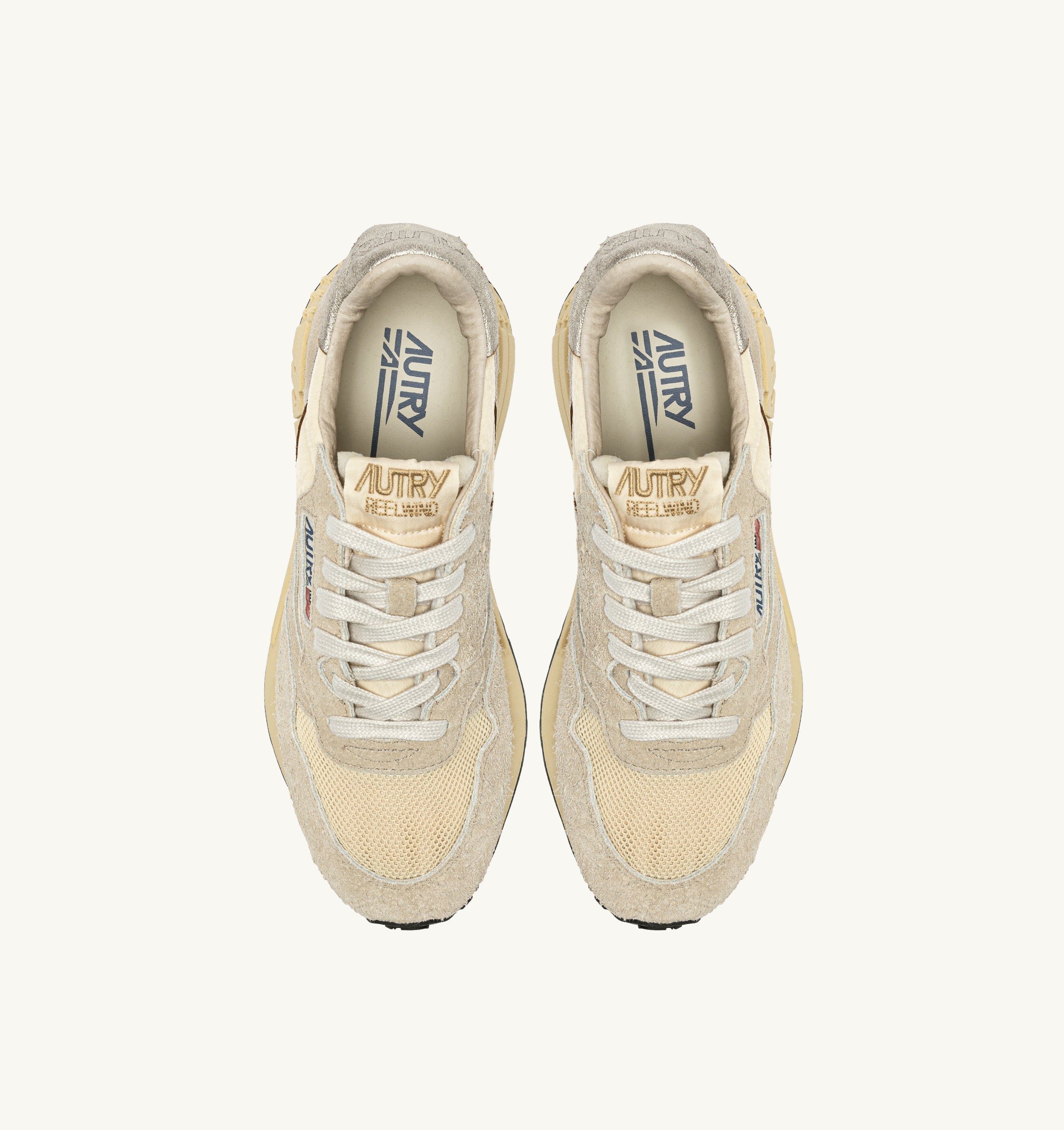 Reelwind low sneakers offer the technical edge of a performance sports shoe with the unmistakable style of the Autry aesthetic. This women's athletic shoe is crafted from beige nylon and is reinforced by inserts in color matching suede and platinum color metalized leather that create a dynamic design.