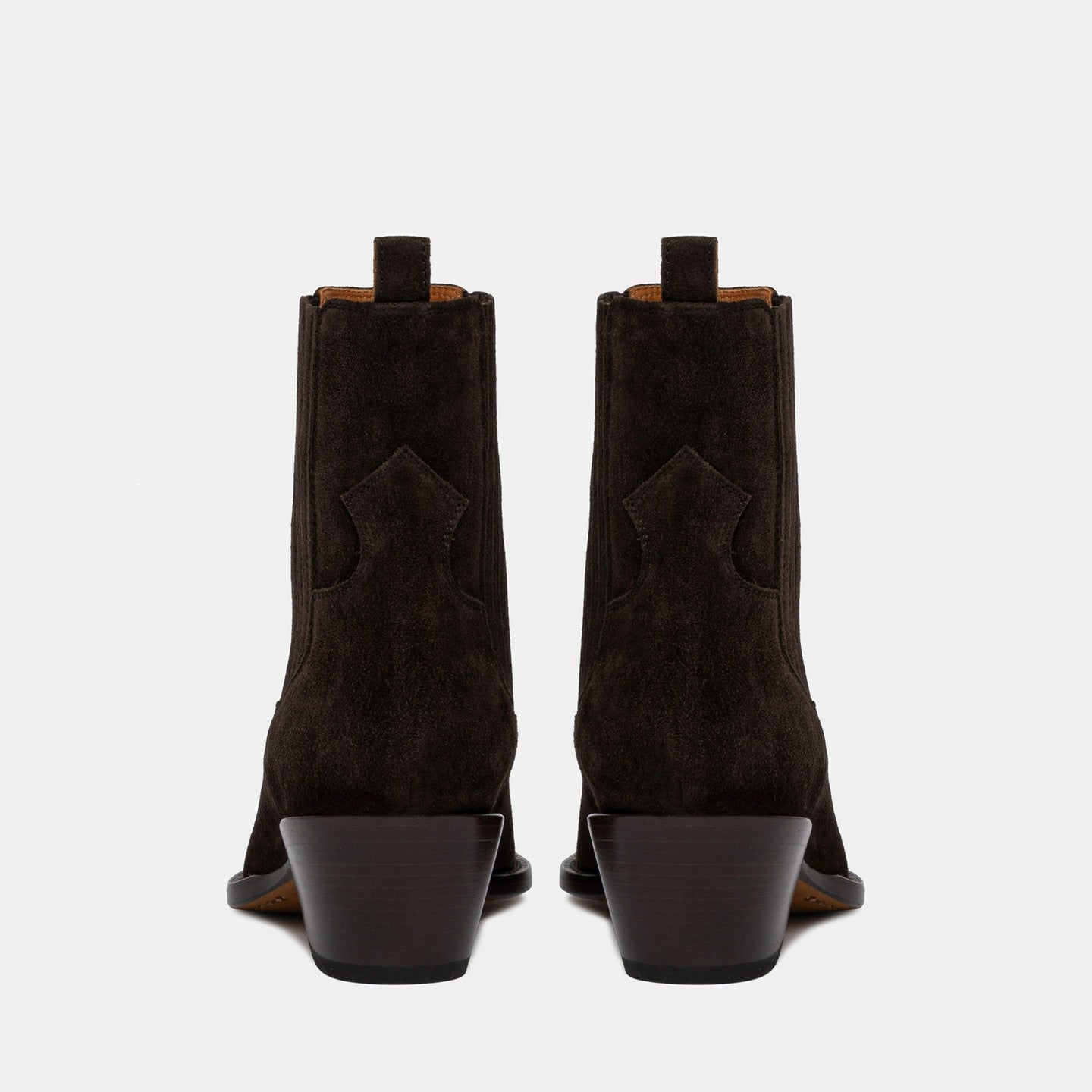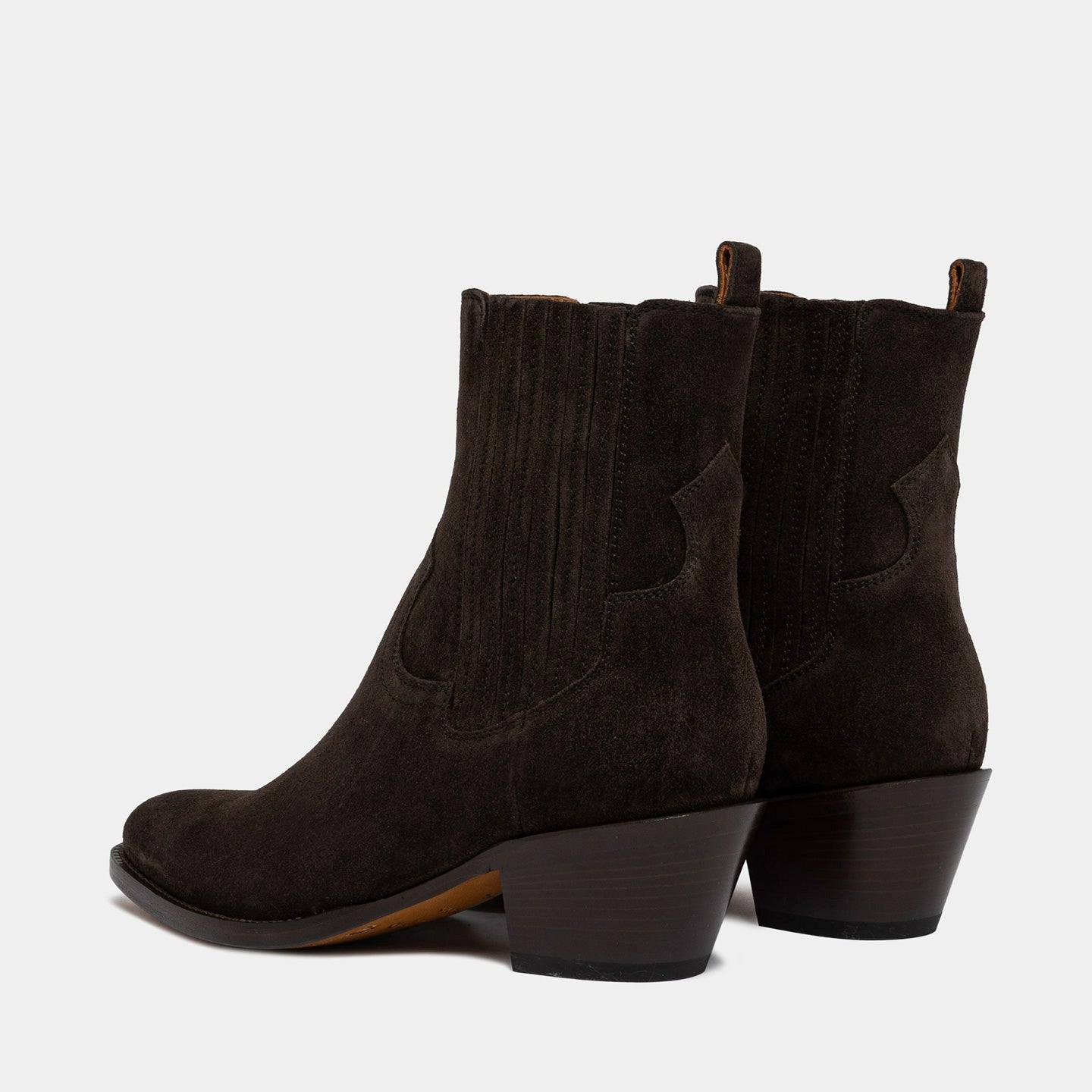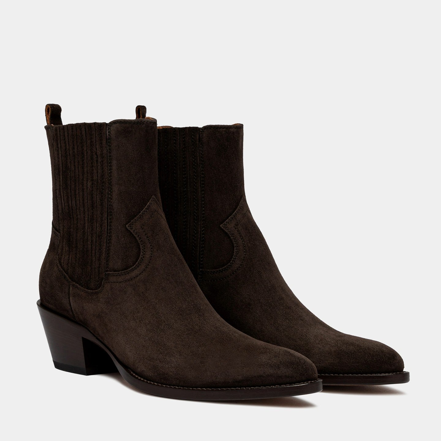 Western-inspired Annie Ankle Boots in moka brown suede with elastic.