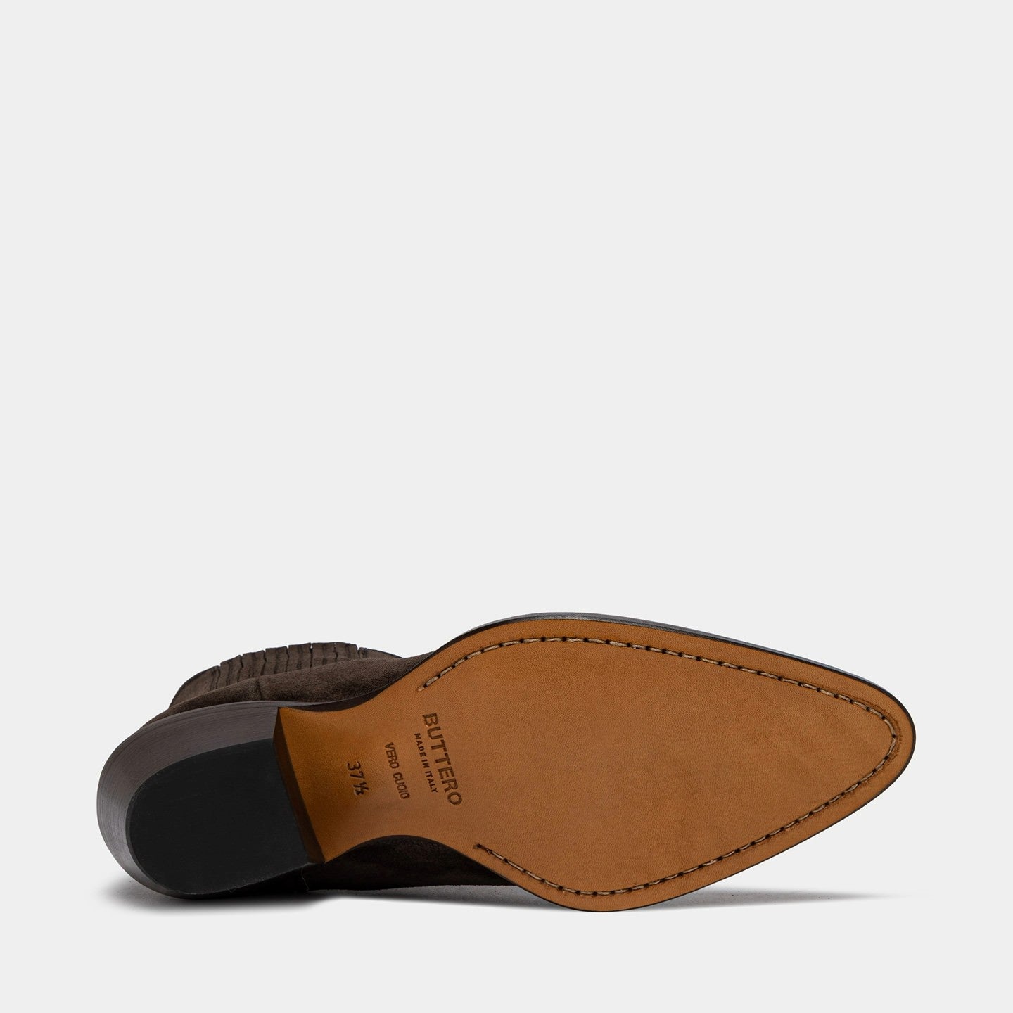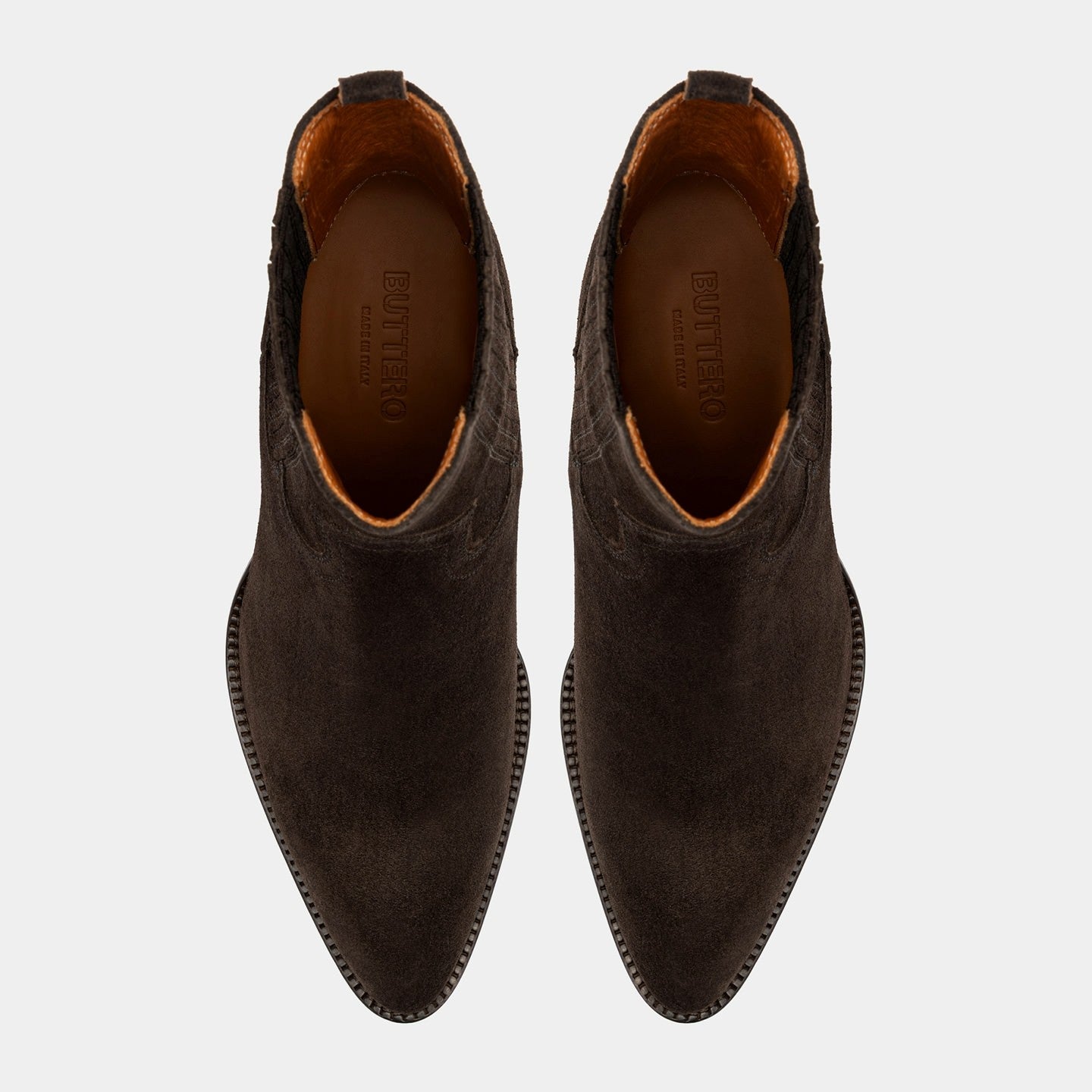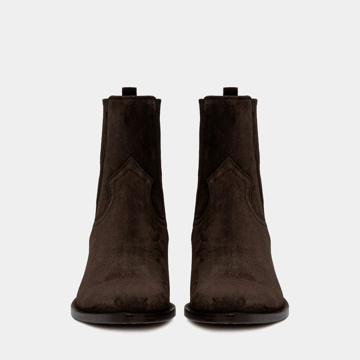 Western-inspired Annie Ankle Boots in moka brown suede with elastic.
