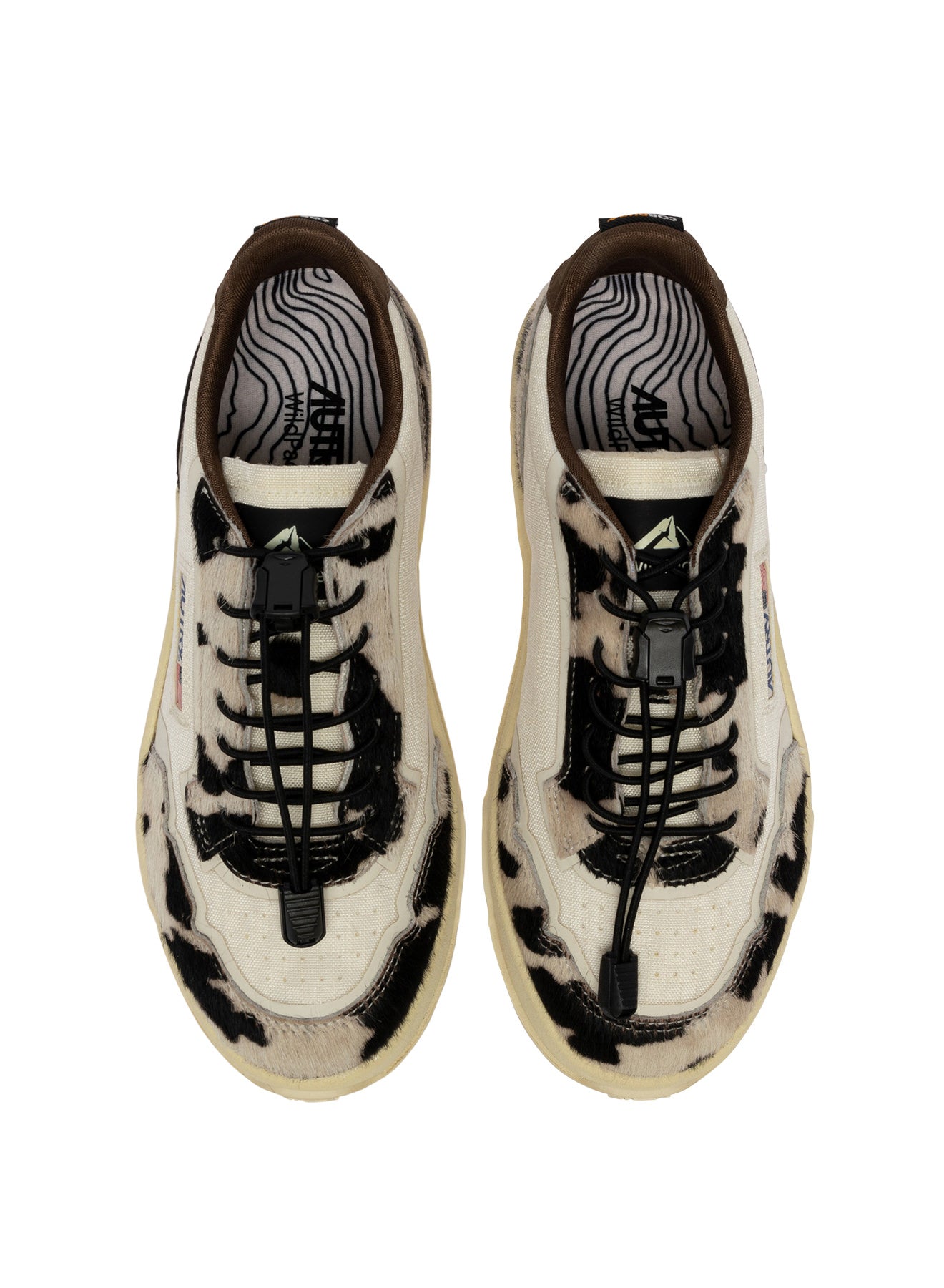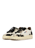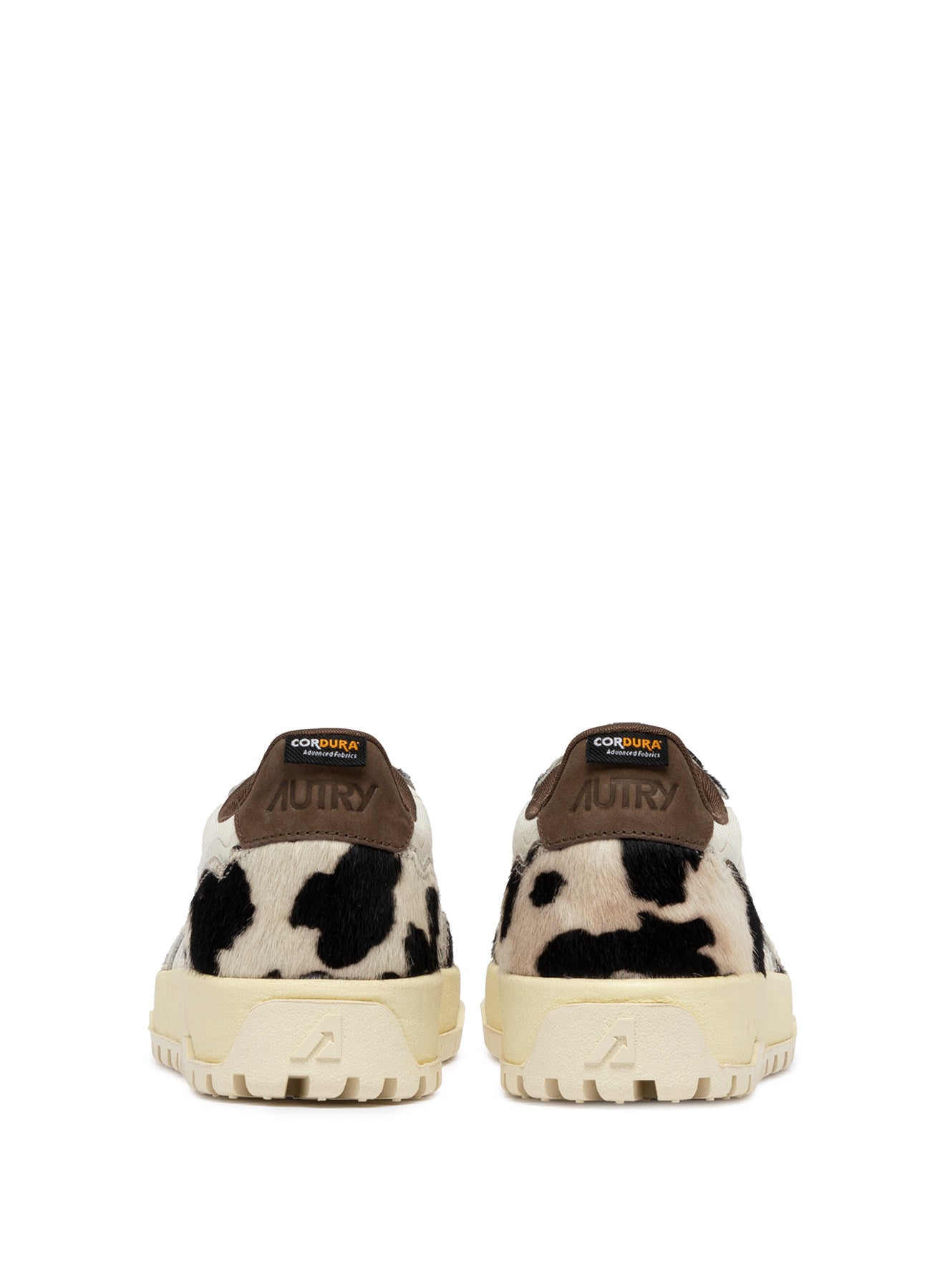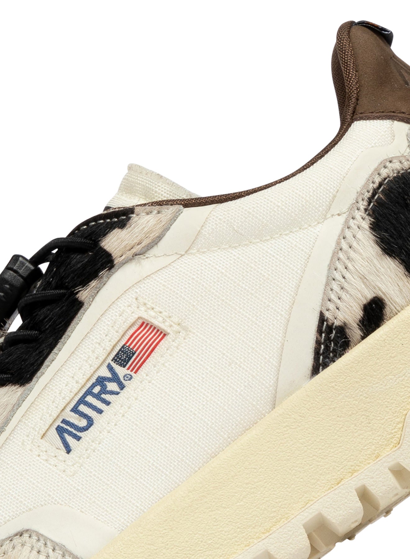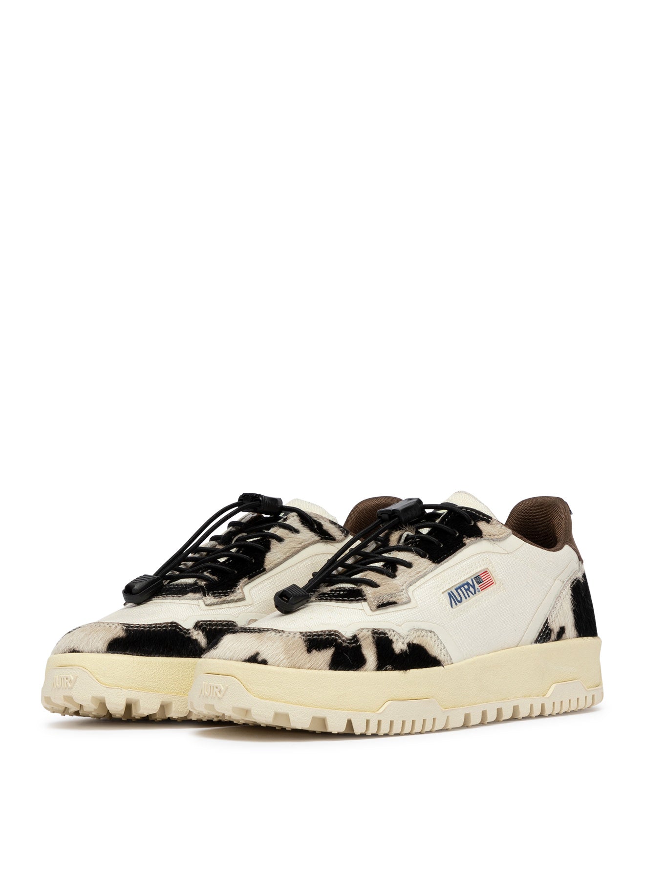 Reelwind sneakers blend Autry’s signature style with elements inspired by the world of running. Made of ivory white cordura fabric with ‘cow print’ pony skin-effect inserts, enriched with coated TPU details, a side detail with the Autry logo, and a leather heel tab with embossed logo.