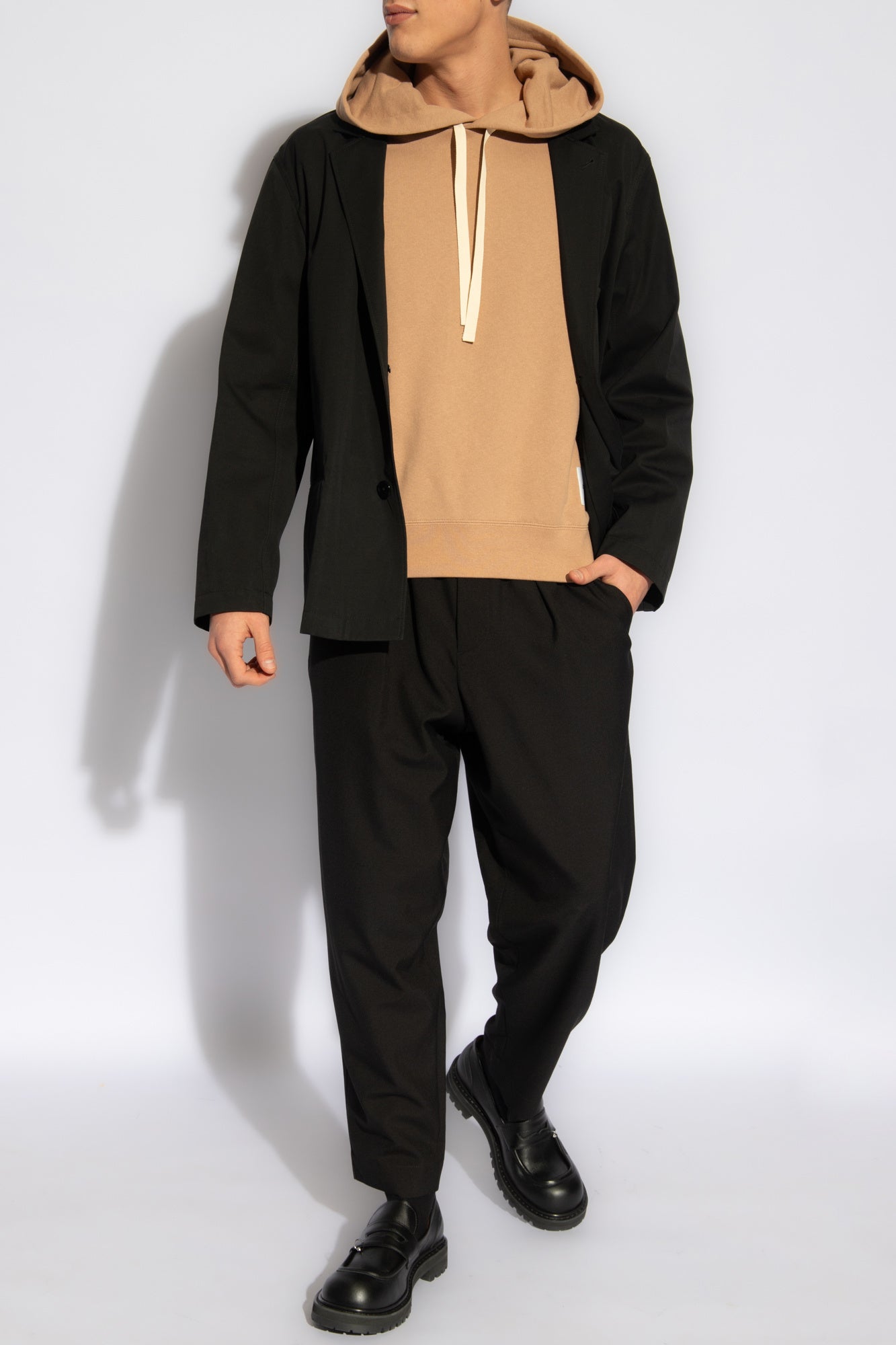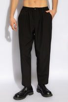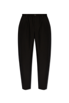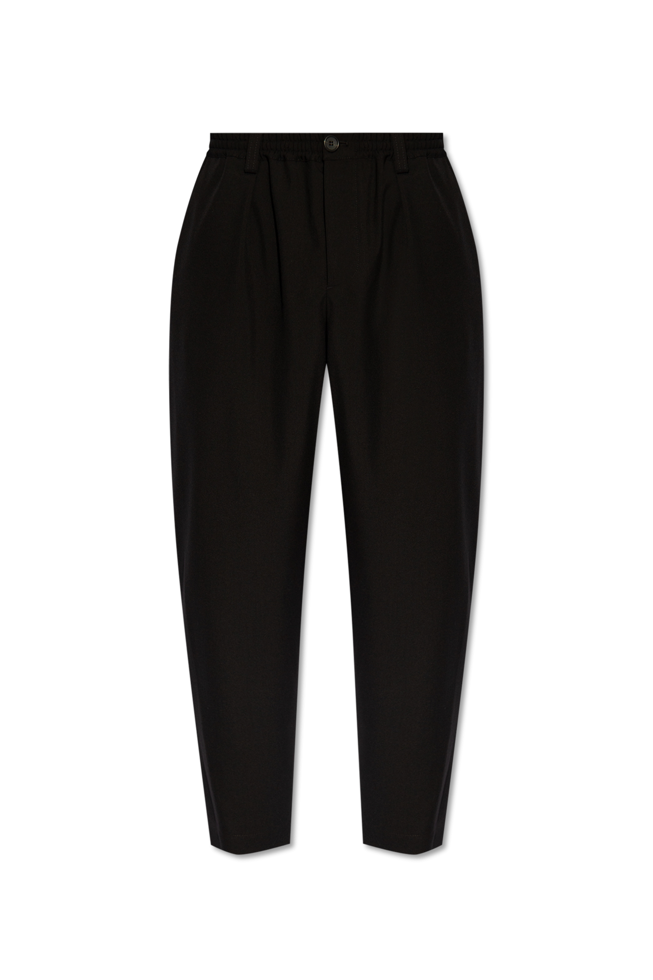 Cropped trousers made from tropical wool. Loose mid-rise fit with front pleats, elasticated drawstring waist and belt loops. Horn button closure. Slant pockets and back buttoned welt pockets.