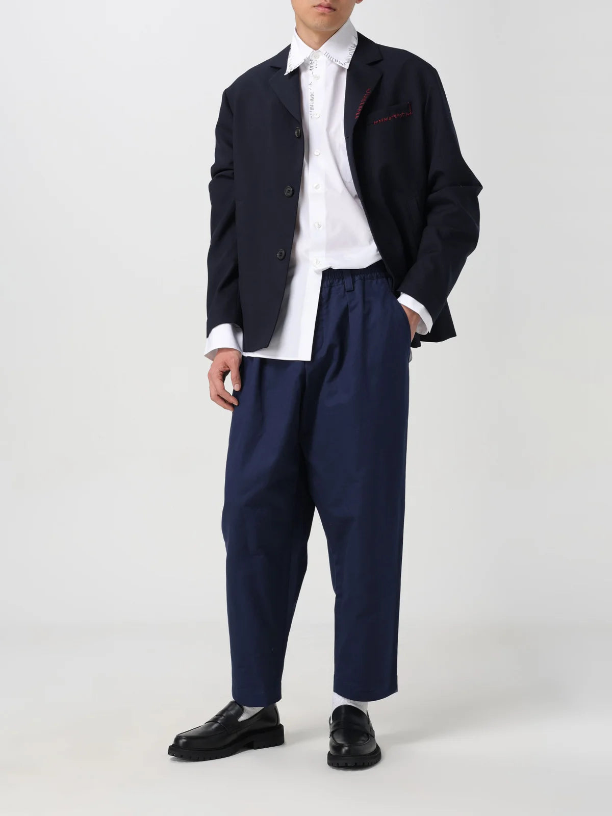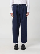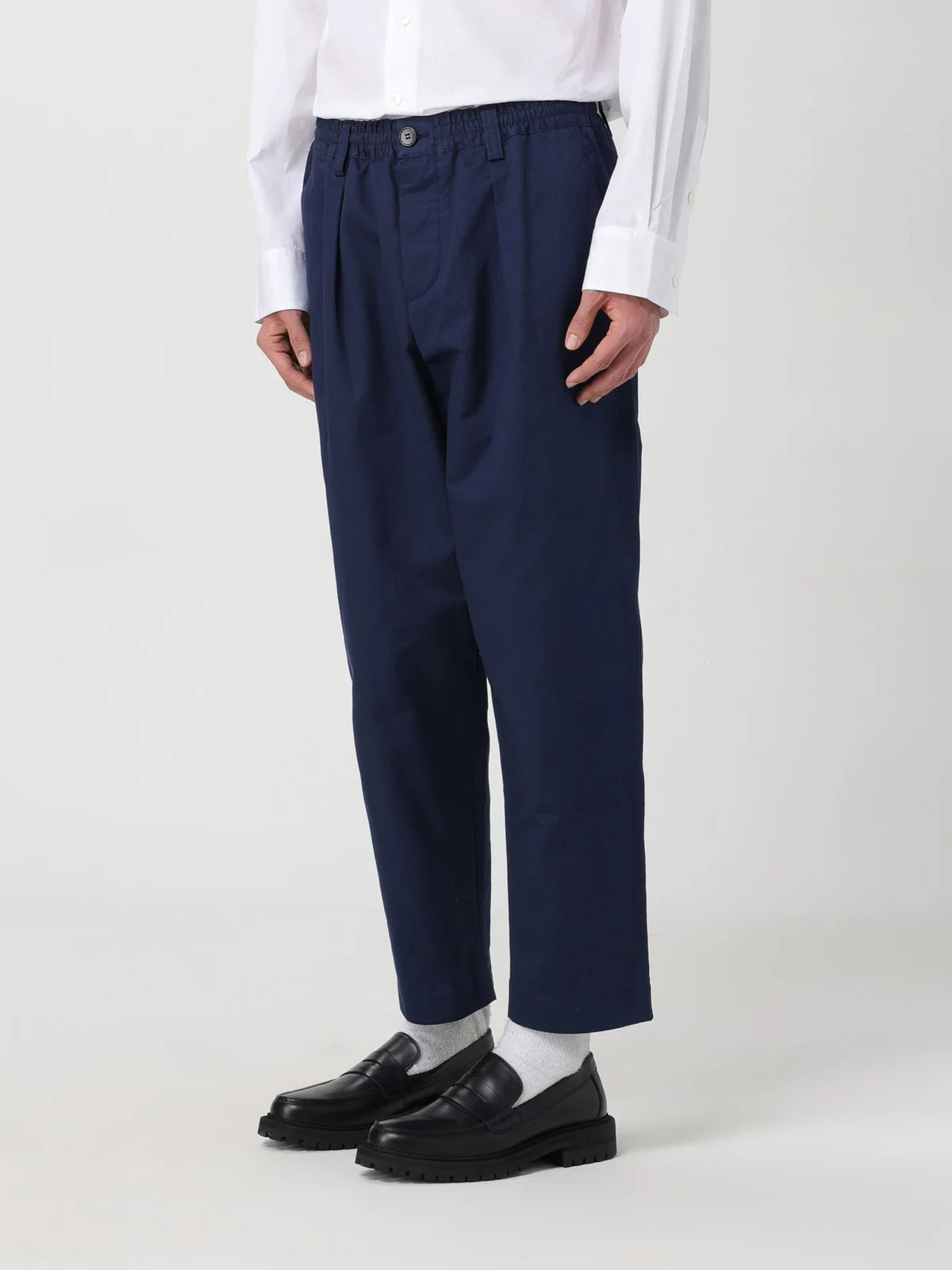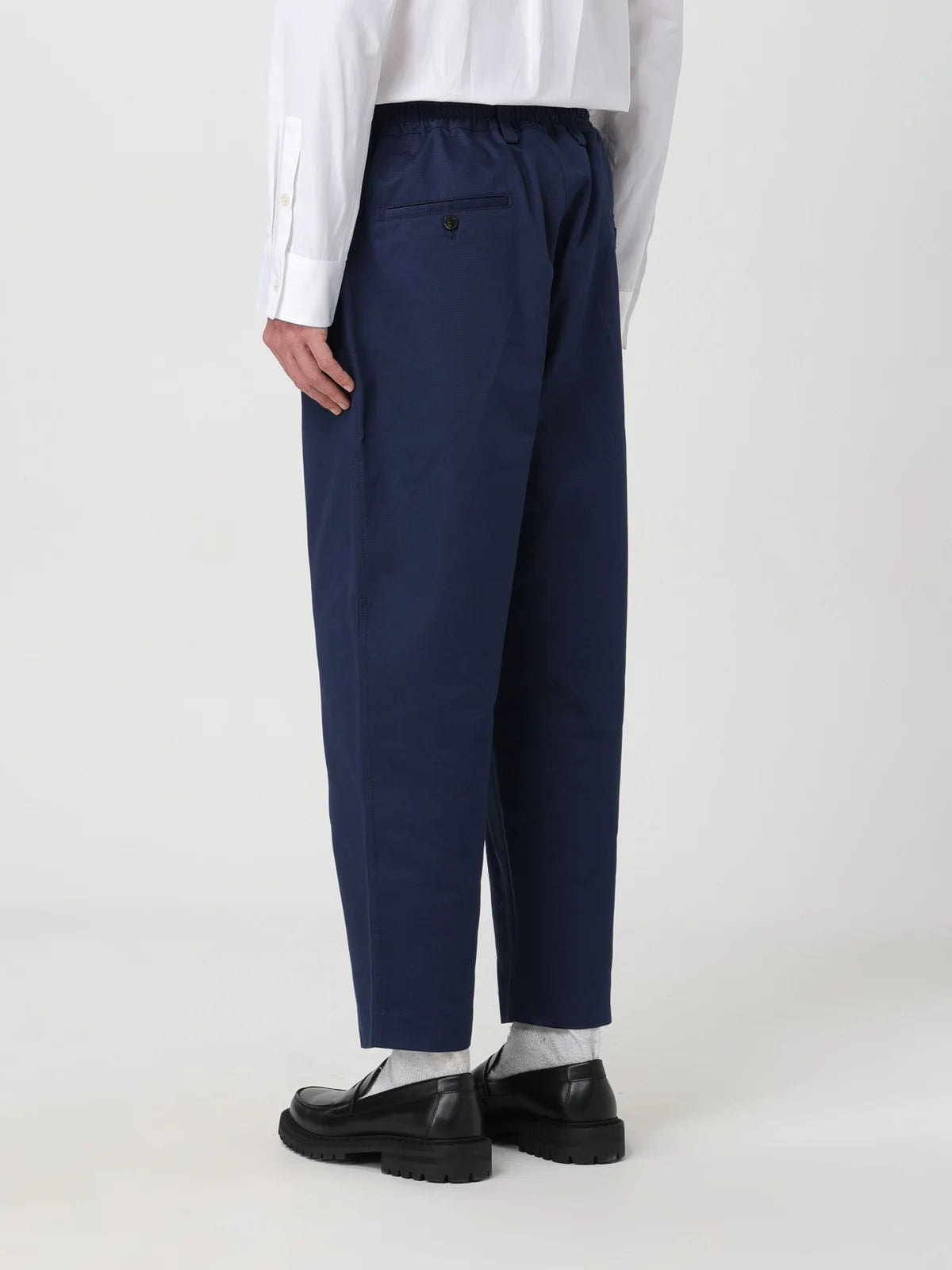 Cropped trousers made from tropical wool. Loose mid-rise fit with front pleats, elasticated drawstring waist and belt loops. Horn button closure. Slant pockets and back buttoned welt pockets.