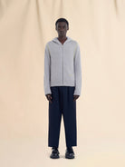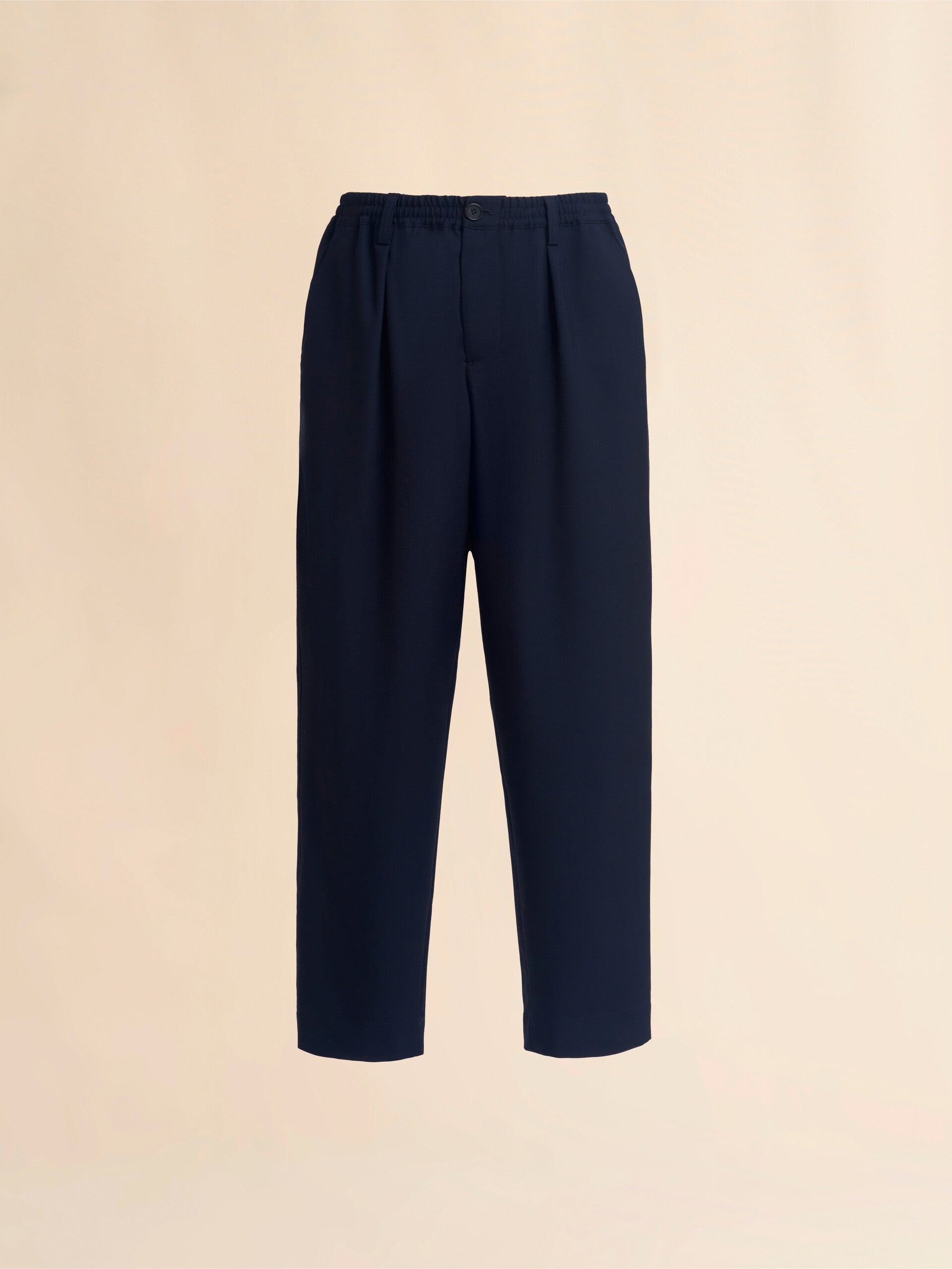 Cropped trousers made from tropical wool. Loose mid-rise fit with front pleats, elasticated drawstring waist and belt loops. Horn button closure. Slant pockets and back buttoned welt pockets.