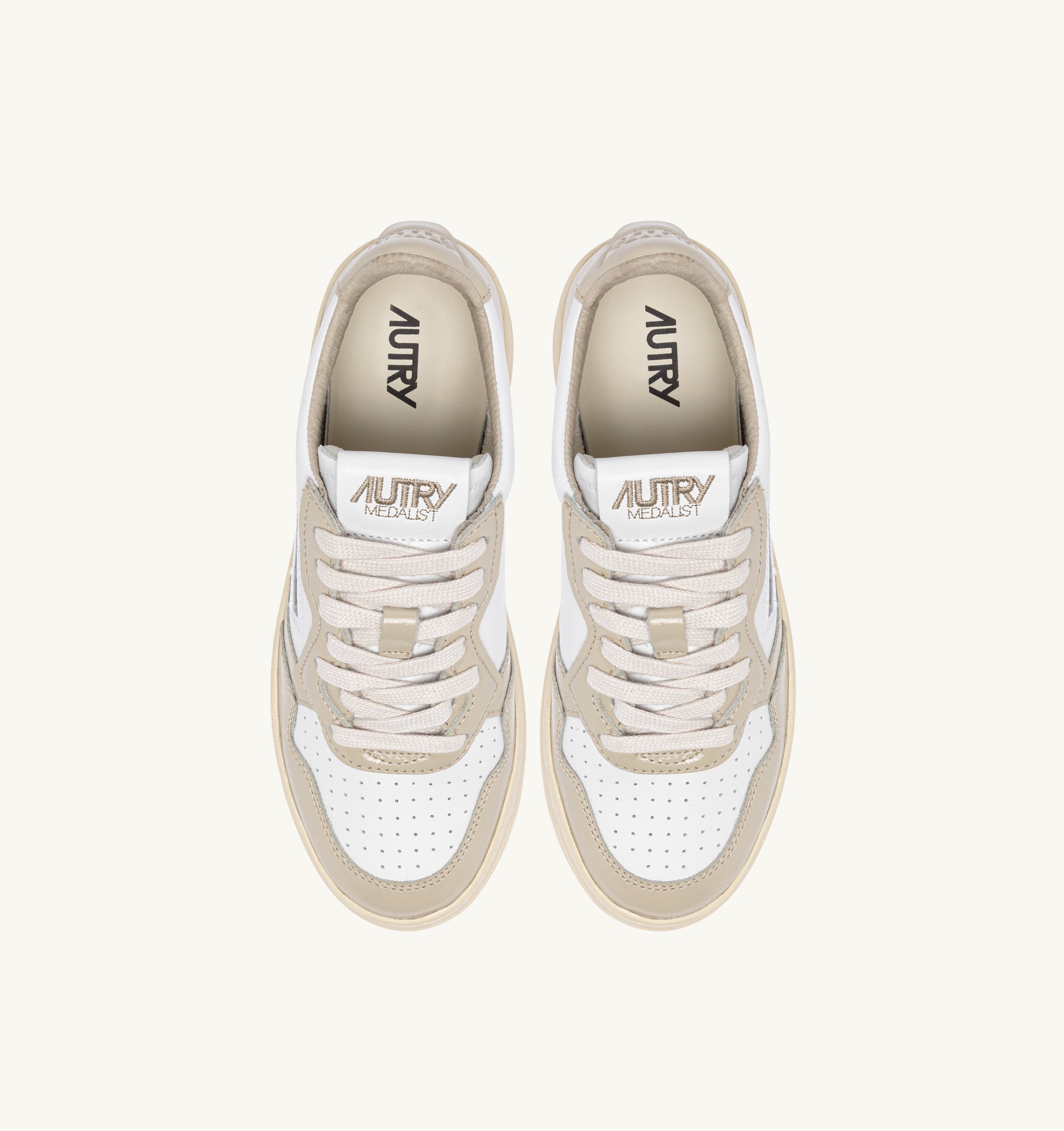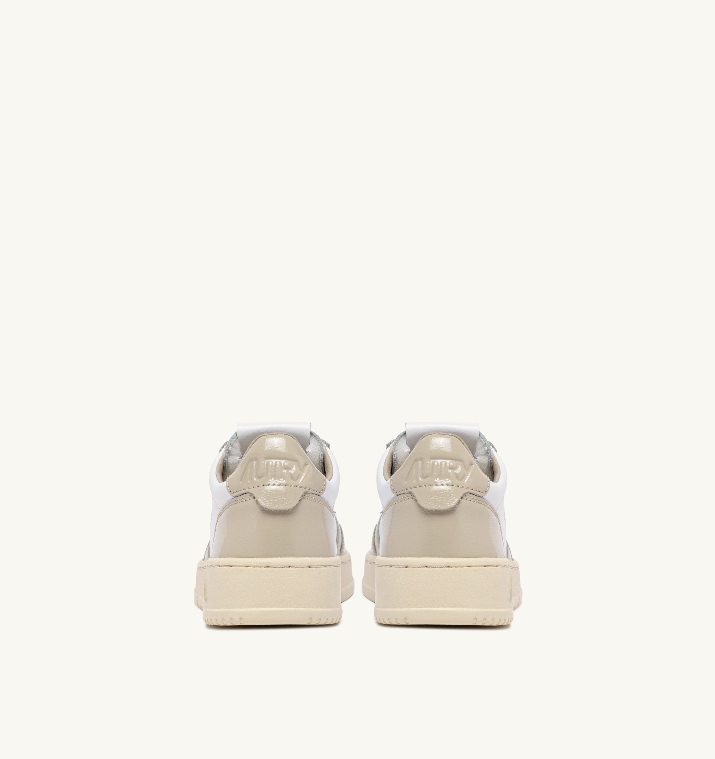 This women’s sneakers is crafted from soft, naturally textured white leather, finished with patent leather inserts color beige. Micro-perforations at the toe ensure excellent breathability and the details at the outer side and heel are adorned with the Autry logo.