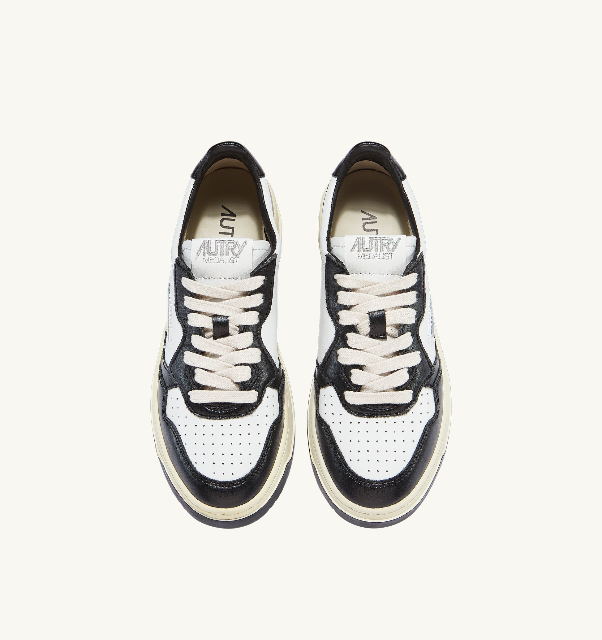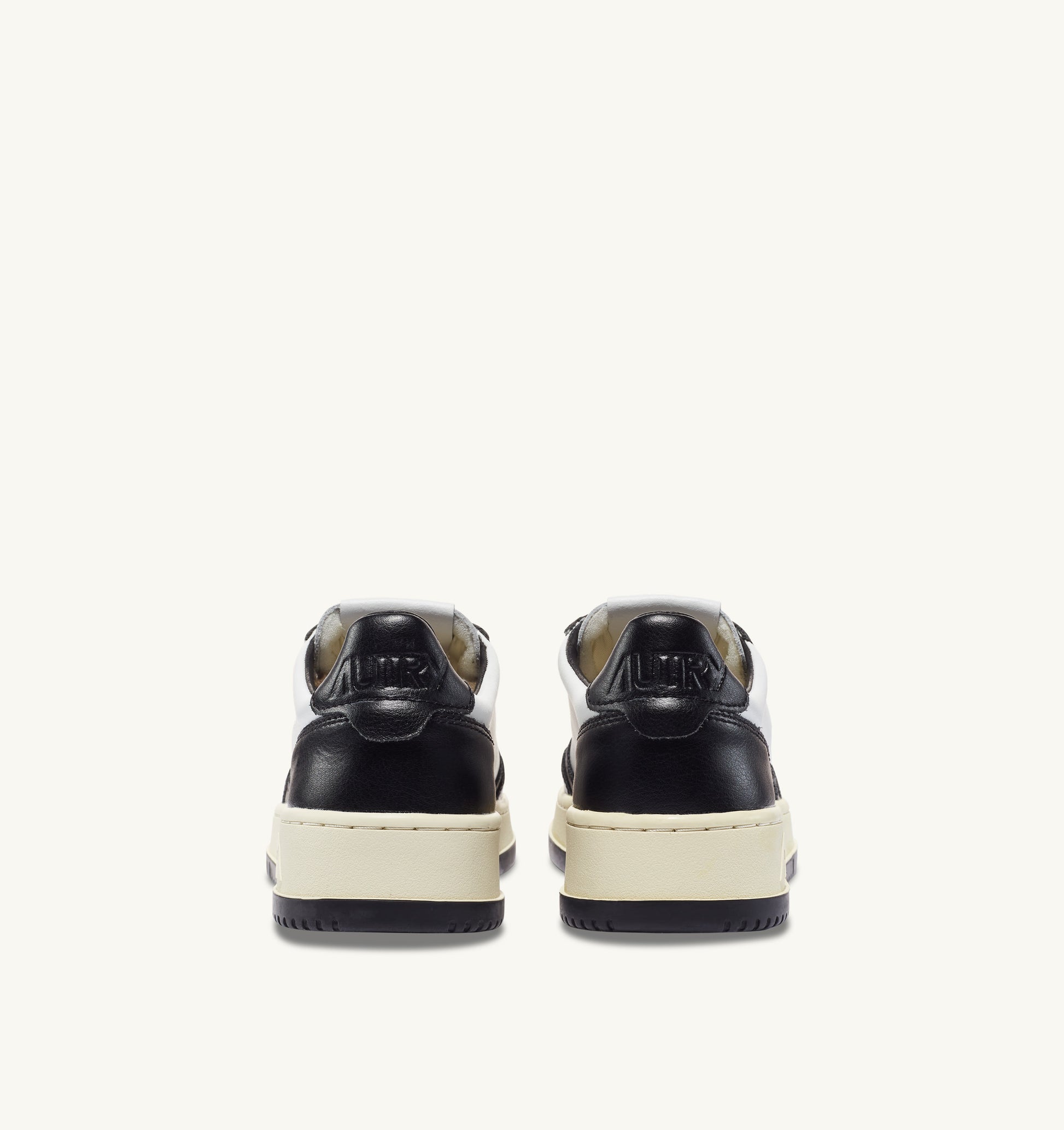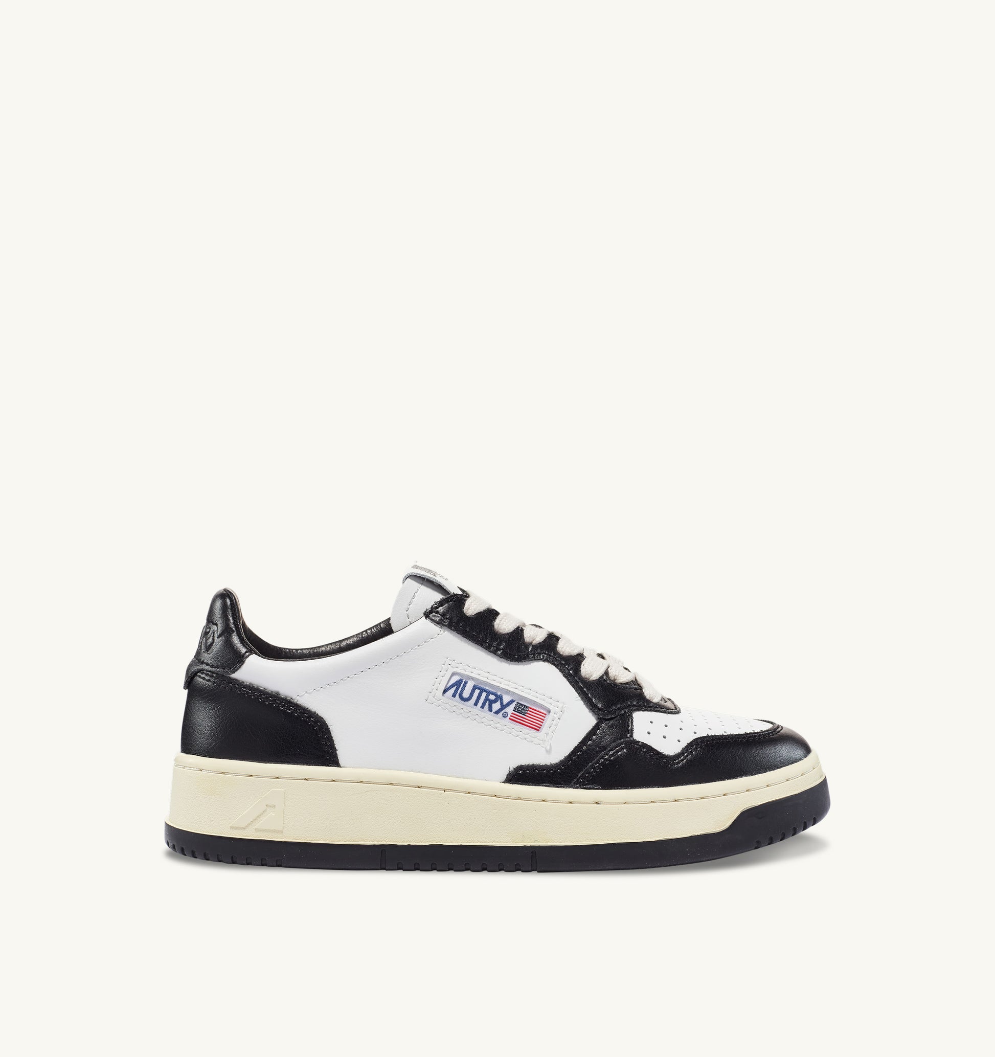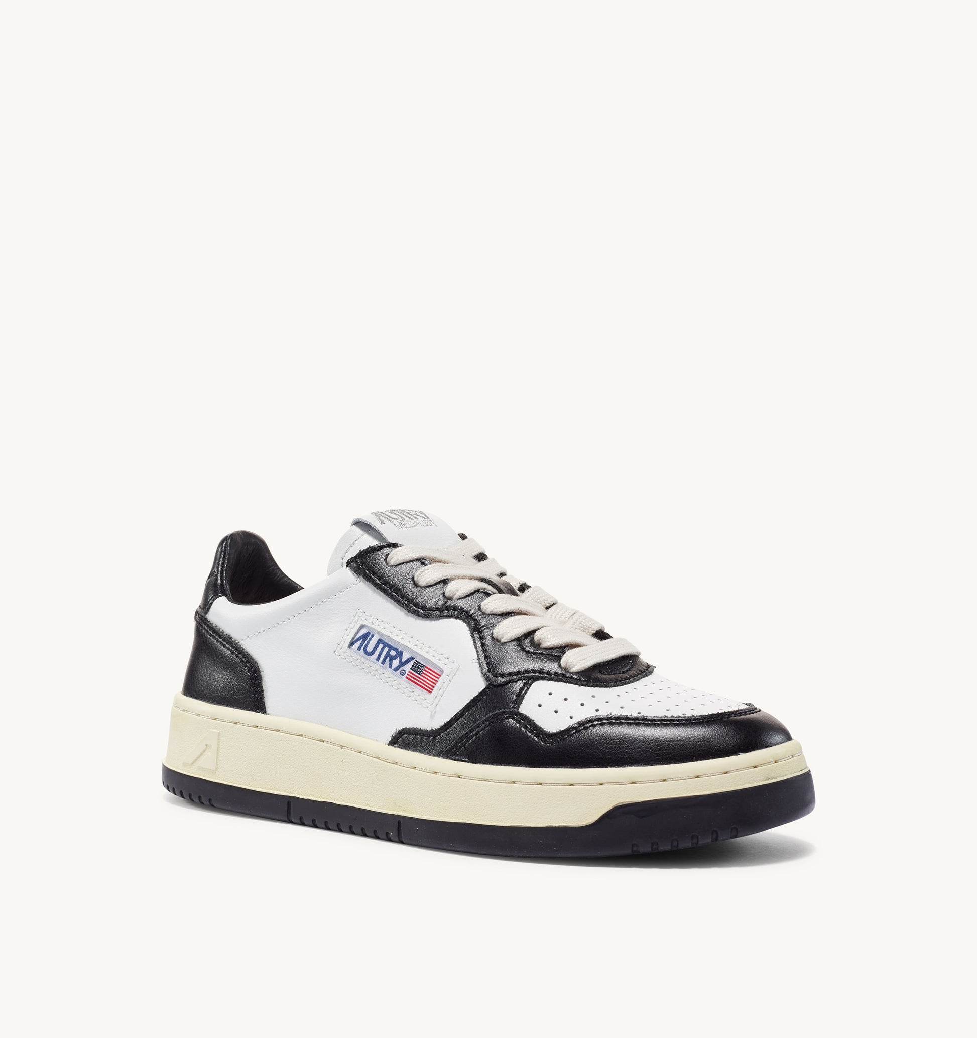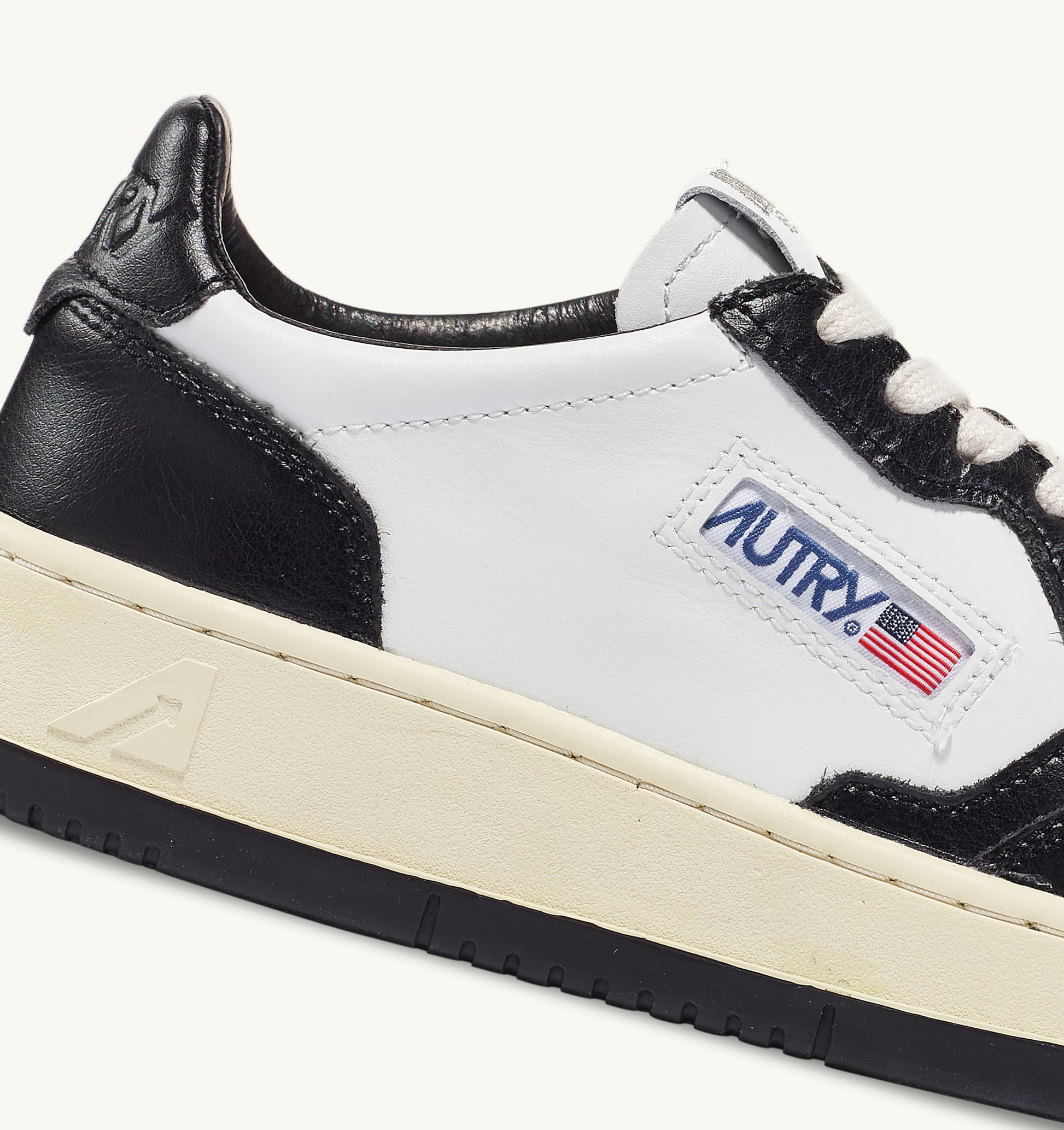 This women's version channels the attitude of the original Autry design, inspired by 1980s tennis shoes, updating the proportions and materials to ensure excellent comfort and contemporary appeal. Crafted from soft leather with a supple, authentic look and feel, it features a bold white and black colour block pattern, and a natural rubber sole with a black tread to add rhythm to your step.