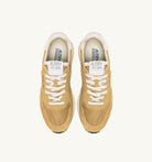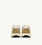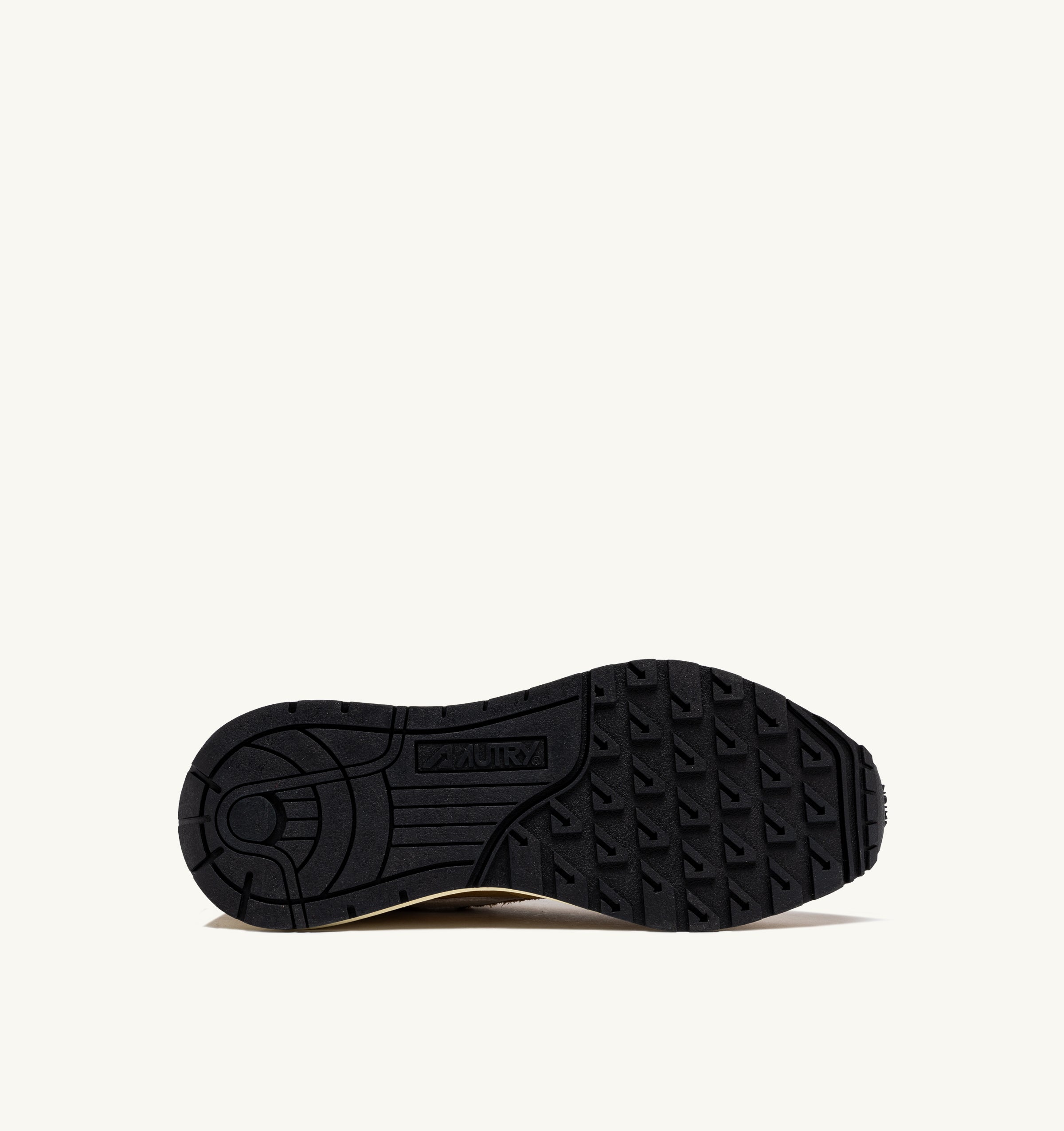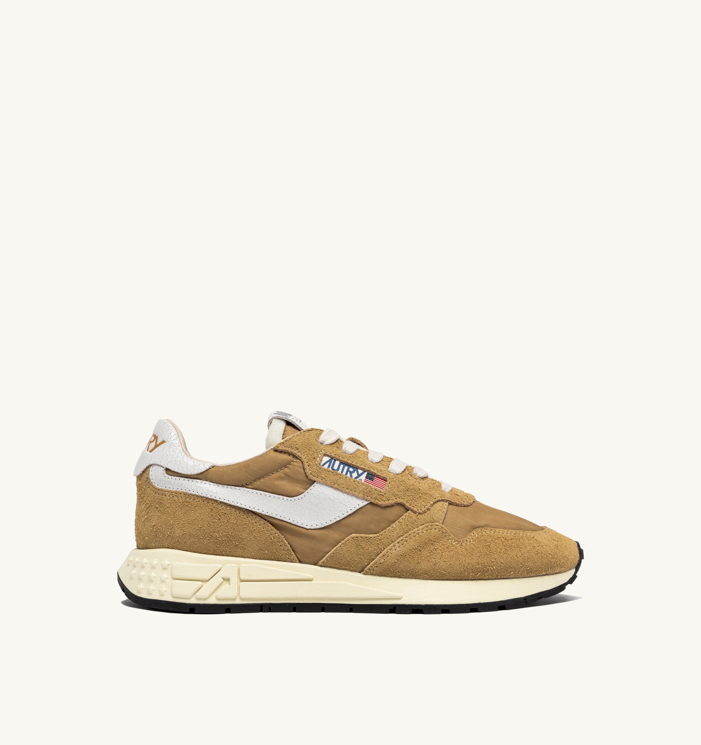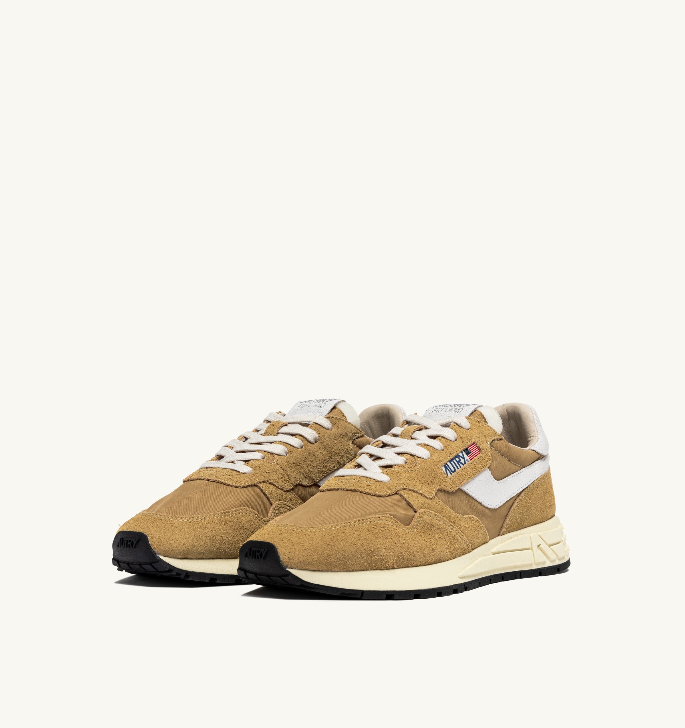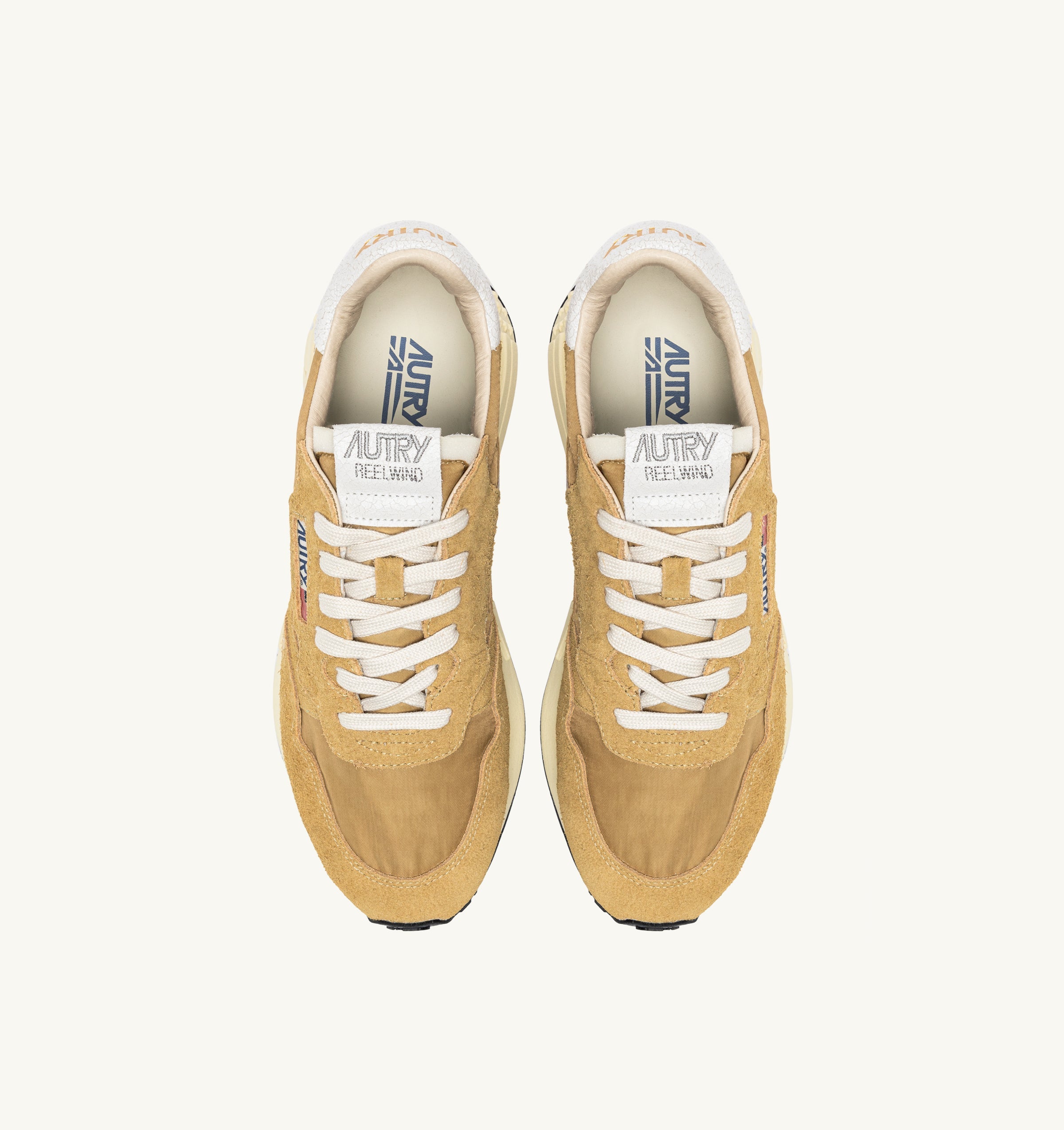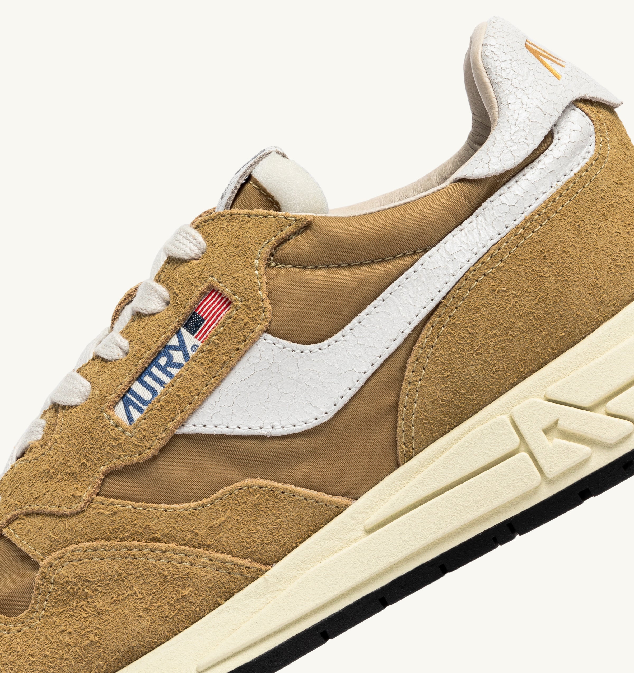 Sporty performance and metropolitan lifestyle. The men’s Reelwind sneakers explores street dynamism with a panel construction that combines nylon and suede in color matching dark yellow tones, accented with crackle-effect white leather inserts.
