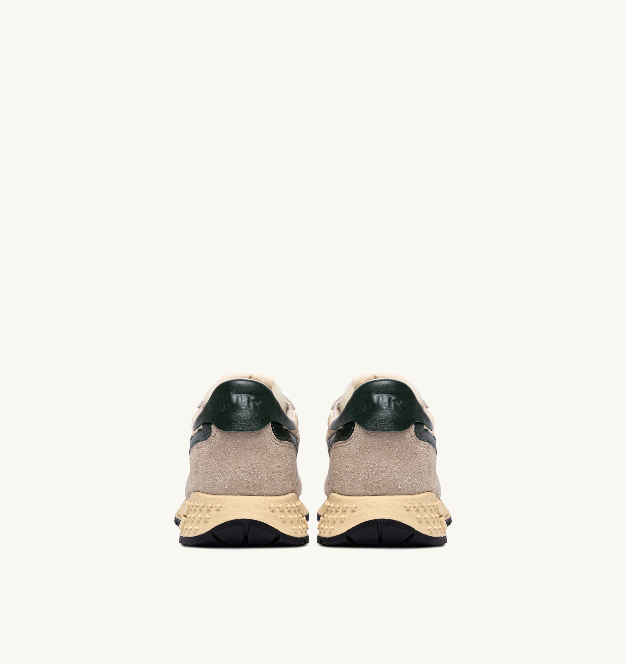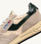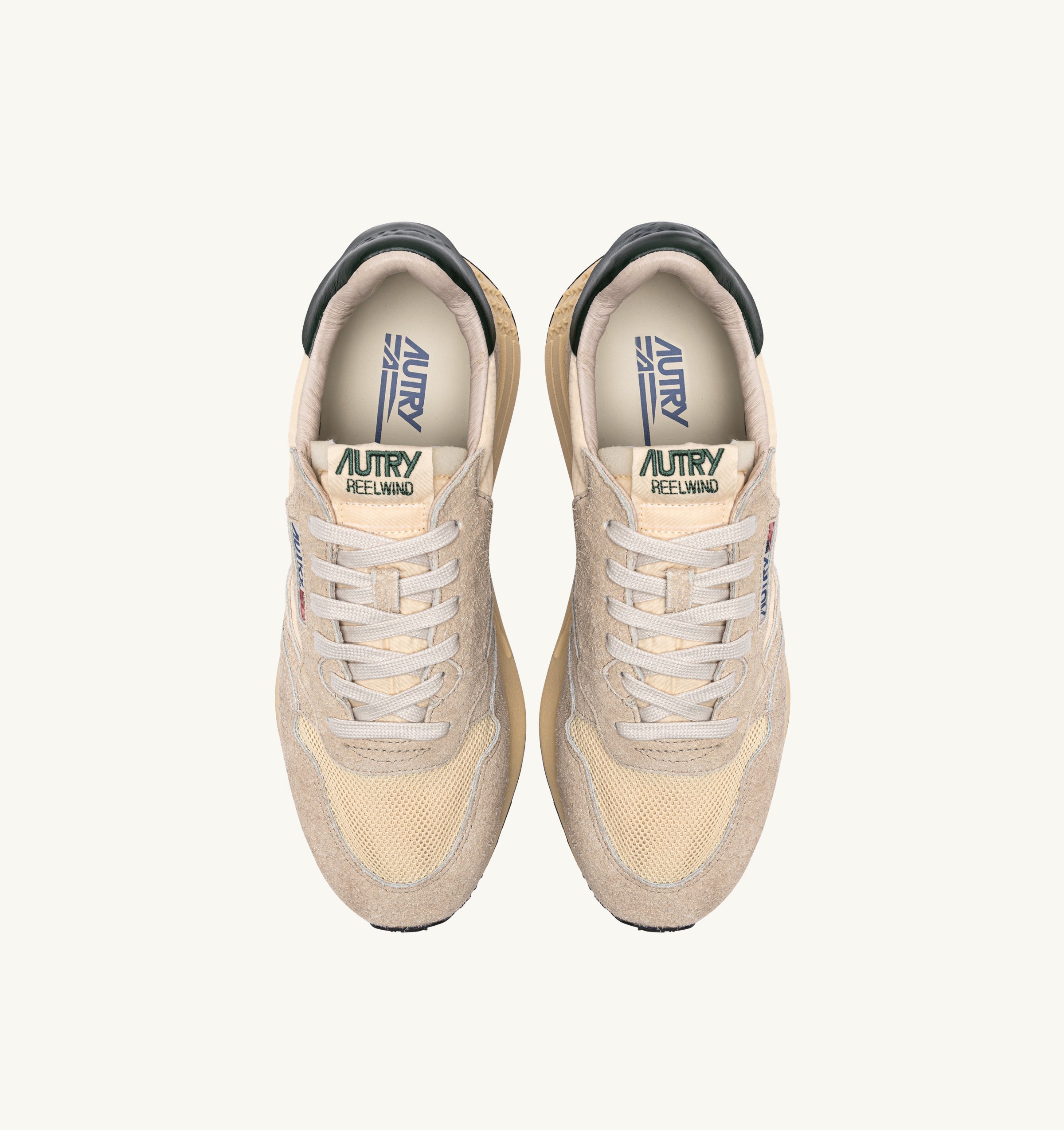Reelwind low sneakers offer the technical edge of a performance sports shoe with the unmistakable style of the Autry aesthetic. This men’s athletic shoe is crafted from beige nylon and is reinforced by inserts in color matching suede and dark green leather that create a dynamic design.