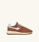 Sporty performance and metropolitan lifestyle. The men’s Reelwind sneakers explores street dynamism with a panel construction that combines nylon and suede in color matching brown tones, accented with crackle-effect white leather inserts.