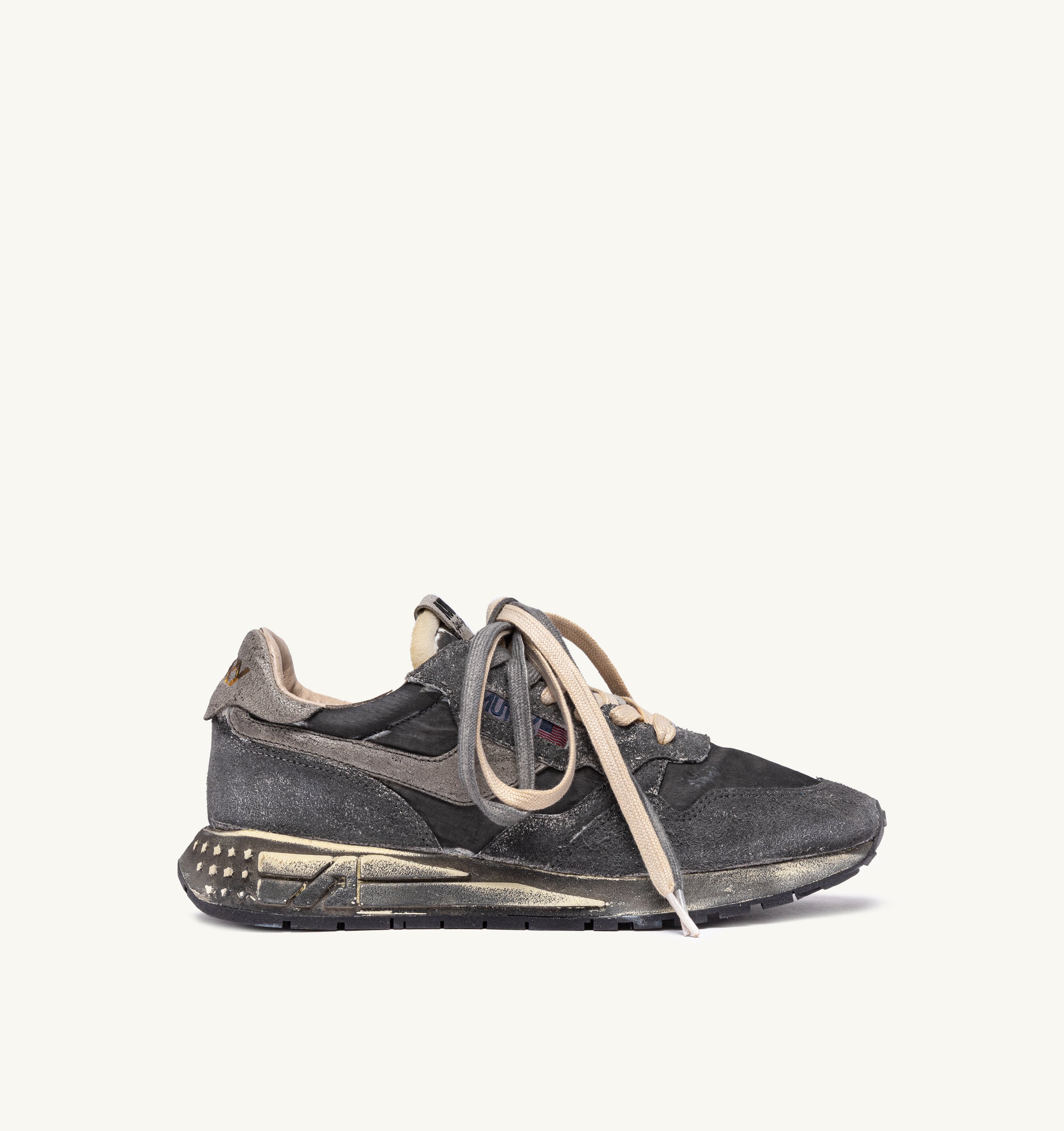 Designed for a dynamic lifestyle, it features a streamlined silhouette and performance construction that ensures maximum freedom of movement. The rubber sole with an embossed tread is personalized with a star pattern and an A-arrow that offers a graphic and modern reinterpretation of the logo. The double laces in different colors add a touch of originality. The exclusive treatment used to create the vintage look is entirely Made in Italy.