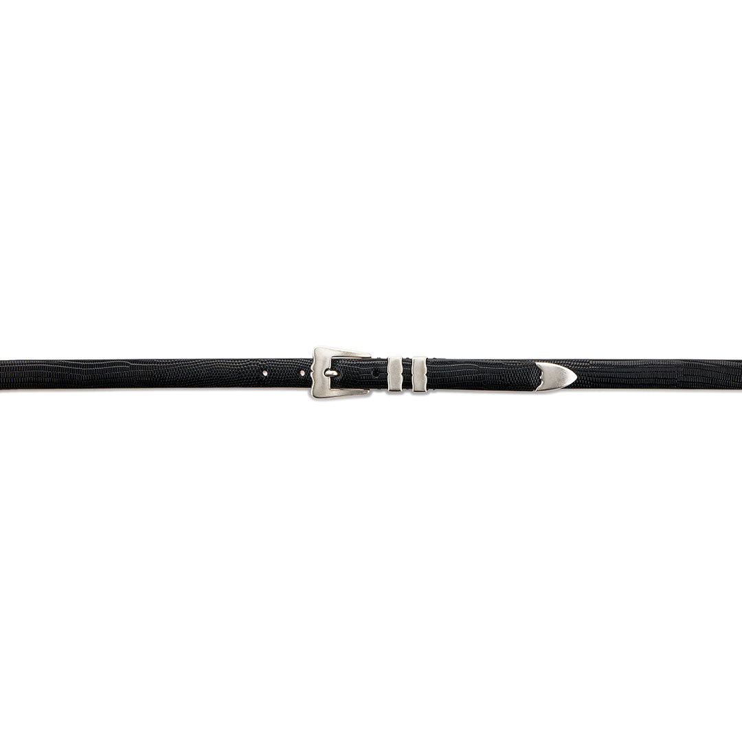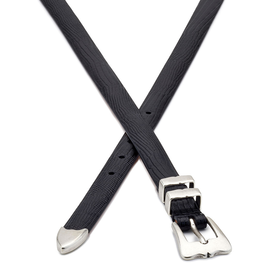 discover the Lobster belt in black exotic-embossed calf leather, an elegant handcrafted slim belt with an angular shiny buckle infused with surrealist spirit.